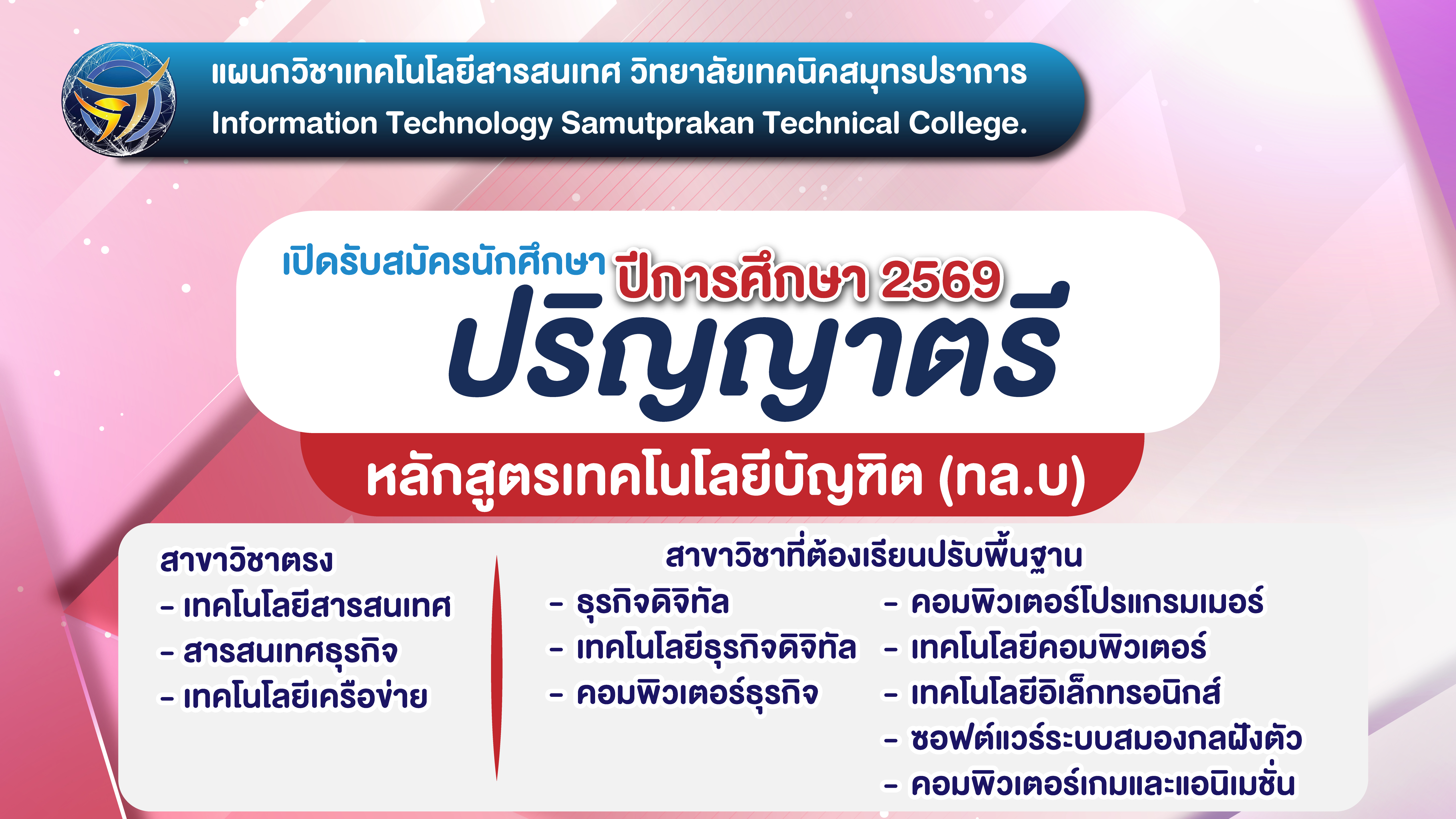 แผนกวิชาเทคโนโลยีสารสนเทศ วิทยาลัยเทคนิคสมุทรปราการ เปิดรับสมัครนักศึกษาใหม่ ระ…
