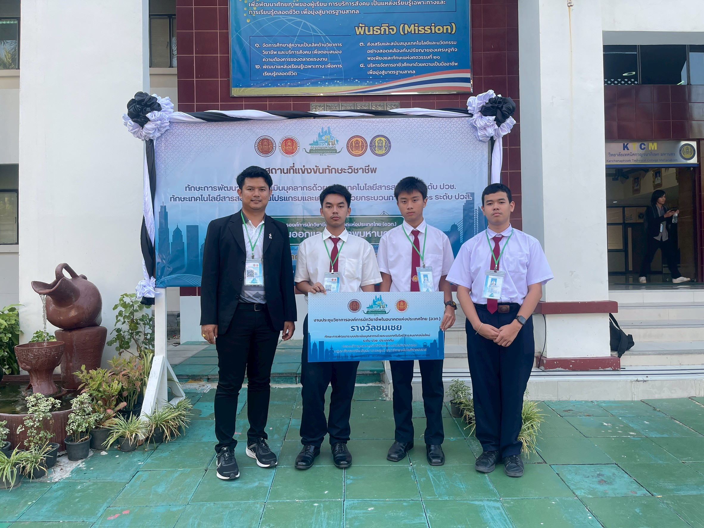 ขอแสดงความยินดี รางวัลรองชนะเลิศอันดับ 3 มาตรฐานเหรียญเงิน ทักษะการพัฒนาระบบประเมินบุคลากรด้วยระบบเทคโนโลยีสารสนเทศสมัยใหม่ ระดับ ปวช. ประเภท ทีม ผู้เข้าแข่งขัน นายสิทธิโชค พรรณพยอม นายภัทรพล มิยะพันธ์ นายภฑิล เมืองจันทร์ ครูผู้ควบคุม นายดนัย ทับอ่ำ